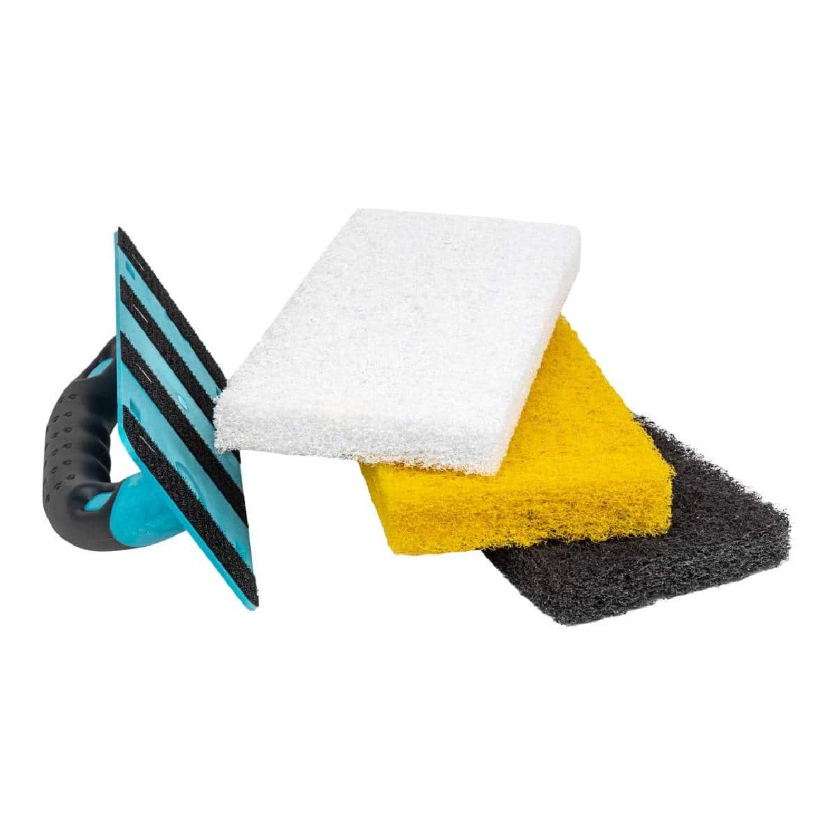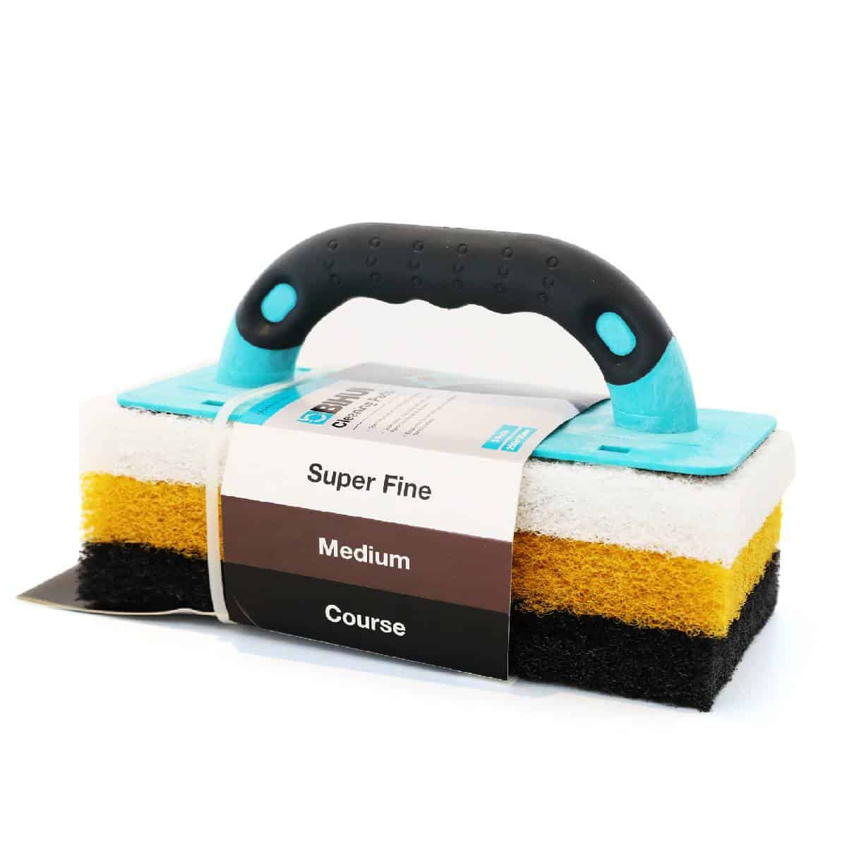 Σετ σφουγγάρια με χειρολαβή ιδανικά για τον καθαρισμό των επιφανειών από διάφορα συγκολλημένα υλικά. 3 τεμάχια : χρώμα άσπρο (πολύ λεπτό) ,κίτρινο (μεσαίο), μαύρο (τραχύ) διαστάσεων 250χ120mm. Συνοδεύονται από πλαστική βάση velcro