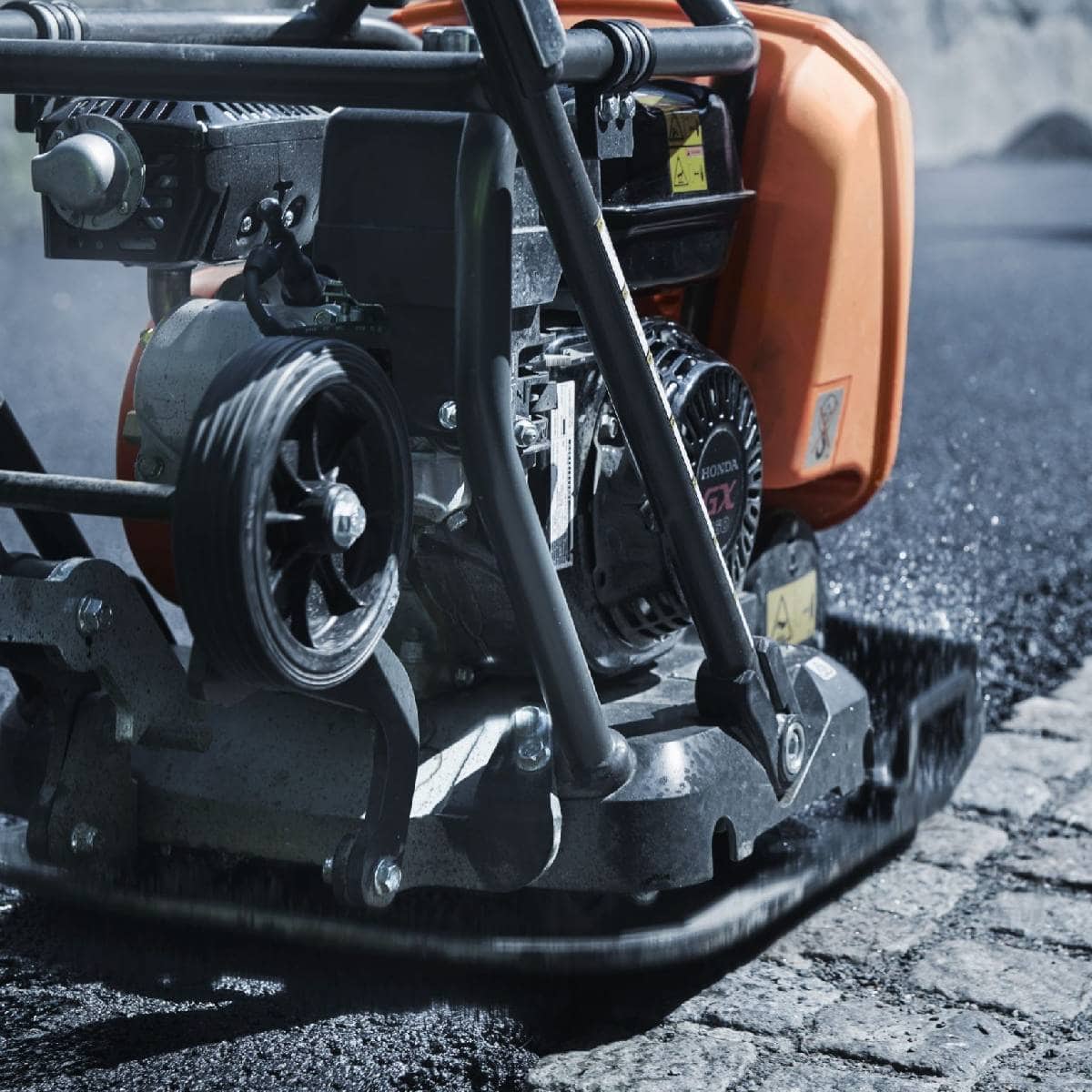 - Βελτιστοποιημένο για άσφαλτο : Η κάτω πλάκα έχει ειδική σχεδίαση για ασφαλτικές εργασίες, η οποία εξασφαλίζει ότι η πλάκα δεν κολλά στην καυτή άσφαλτο και δεν αφήνει σημάδια στα σημεία όπου το μηχάνημα εκτελεί στροφή.