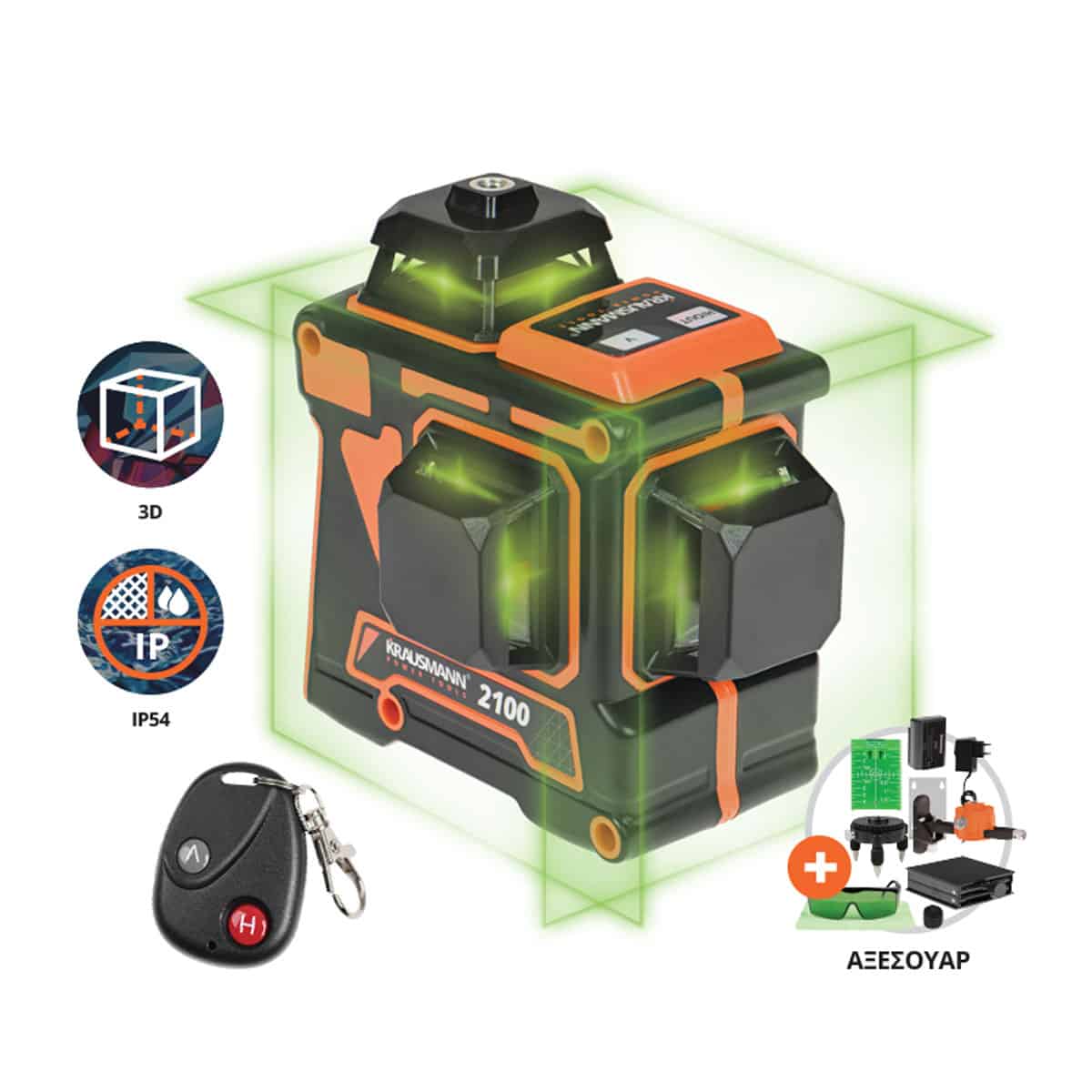 Το αυτοαλφαδιαζόμενο λέιζερ 3D πράσινης δέσμης διαθέτει εκκρεμές σύστημα αυτόματης ευθυγράμμισης. Η πράσινη δέσμη έχει 4 φορές καλύτερη ευκρίνεια από την κόκκινη δέσμη και δίνει τη δυνατότητα προβολής των επίπεδων γραμμών σε μεγάλες αποστάσεις τις οποίες και διατηρεί σε πλήρη φωτεινότητα. Το λέιζερ παρέχει μεγάλη διάρκεια απόδοσης με τη βοήθεια της δυνατής μπαταρίας 2.6 Ah Li-Ion. Με 3 “μάτια”, έχει τη δυνατότητα προβολής 3 γραμμών σε 360°, σε 3 άξονες (3D) και με μεγάλη ακρίβεια (0,143mm/m). Διαθέτει προστασία από σκόνη και υγρασία IP54, καθώς επίσης τηλεχειριστήριο για ασύρματη λειτουργία και μαγνητικό βραχίονα στήριξης για εύκολη τοποθέτηση παντού. Η πρακτική τσάντα μεταφοράς παρέχει πλήθος αξεσουάρ για ευκολία στη χρήση.