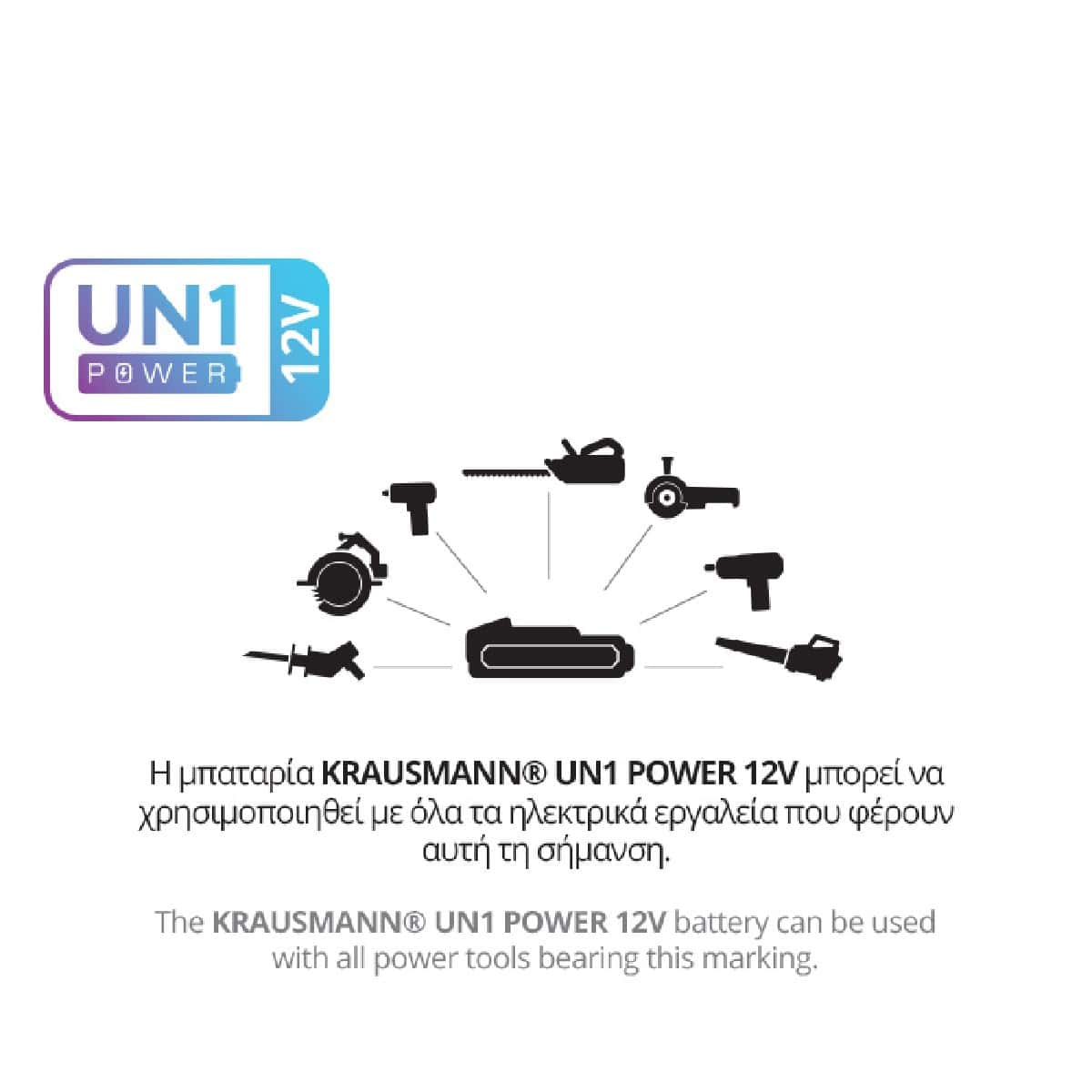 Η μπαταρία KRAUSMANN® UN1 POWER 12V μπορεί να χρησιμοποιηθεί με όλα τα ηλεκτρικά εργαλεία που φέρουν αυτή τη σήμανση.