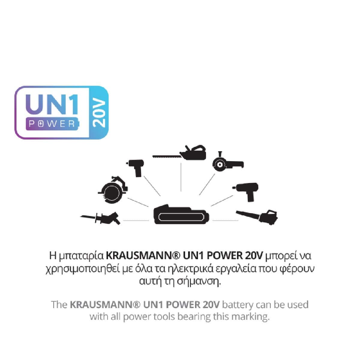 Η μπαταρία KRAUSMANN® UN1 POWER 20V μπορεί να χρησιμοποιηθεί με όλα τα ηλεκτρικά εργαλεία που φέρουν αυτή τη σήμανση.