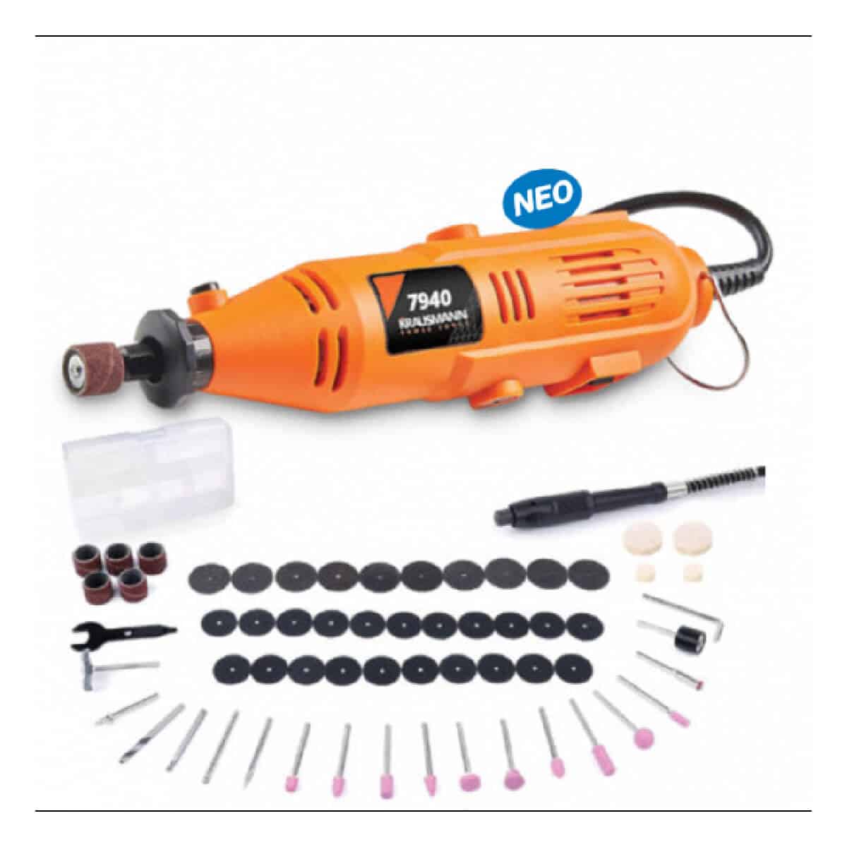 Μίνι ηλεκτρικό εργαλείο με πολλαπλές λειτουργίες χάρη στα 60 διαφορετικά εξαρτήματα που διαθέτει, κατάλληλο για κοπή, χάραξη, λείανση, στίλβωση, τρύπημα, χάραξη και πολλές άλλες εφαρμογές, σε πρακτική πλαστική βαλίτσα για καλύτερη αποθήκευση και μεταφορά.