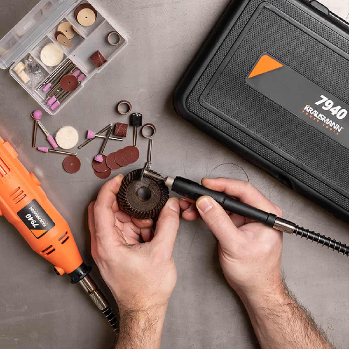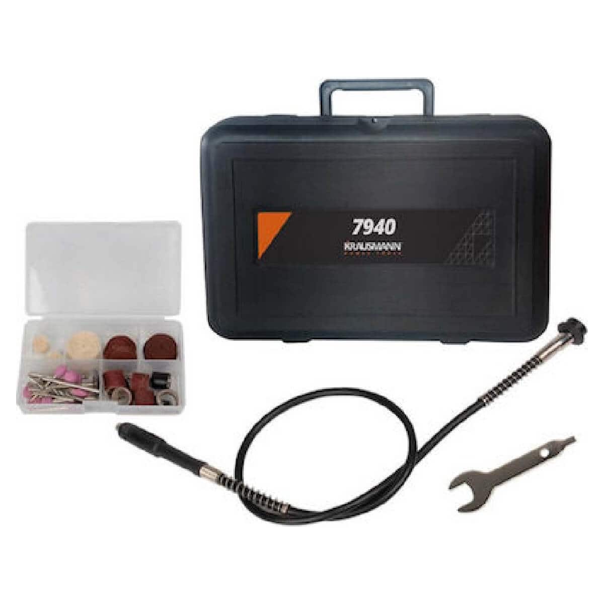 • Πλαστική θήκη αξεσουάρ με περιεχόμενα: 10× τροχοί κοπής fiberglass & 1× άξονας, 10× τροχοί λείανσης με στέλεχος, 5× λωρίδες λείανσης, 1× στέλεχος λείανσης, 20× φύλλα λείανσης, 4× τροχοί γυαλίσματος felt & 1× άξονας, 1× ατσάλινη βούρτσα γυαλίσματος ,1× HSS τρυπάνι, 2× εξάρτημα λείανσης διαμαντιού, 1× εξάρτημα χάραξης