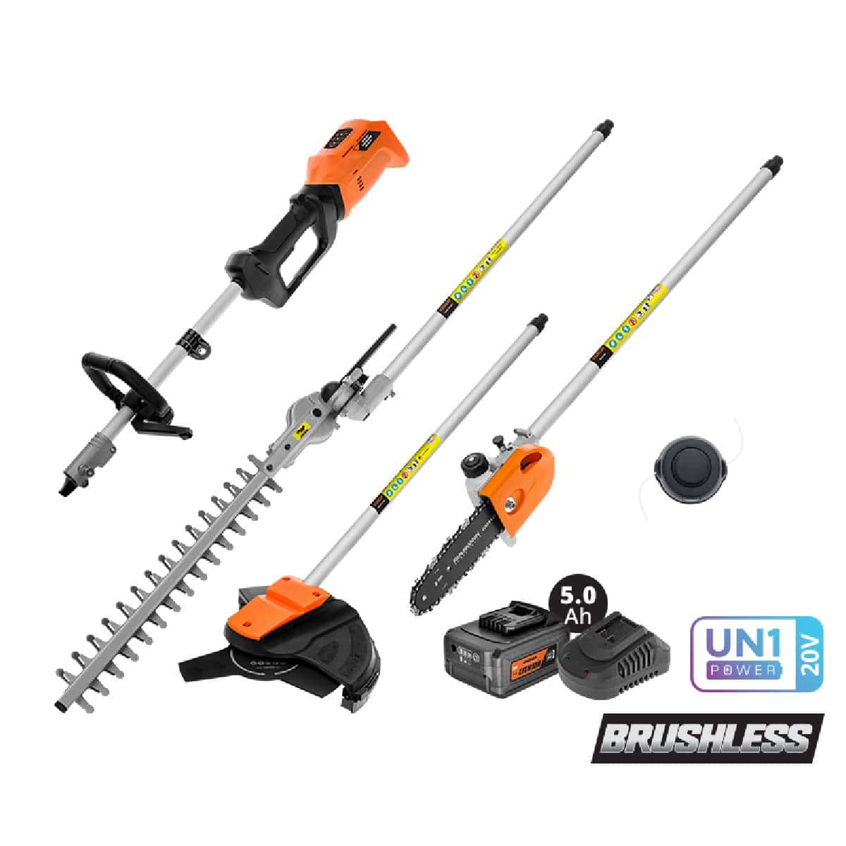 Πολυμηχάνημα 20V, με κινητήρα BRUSHLESS και διαθέσιμα εξαρτήματα ώστε να ανταποκριθείτε σε όλες τις εργασίες στον κήπο ή τον αγρό.
